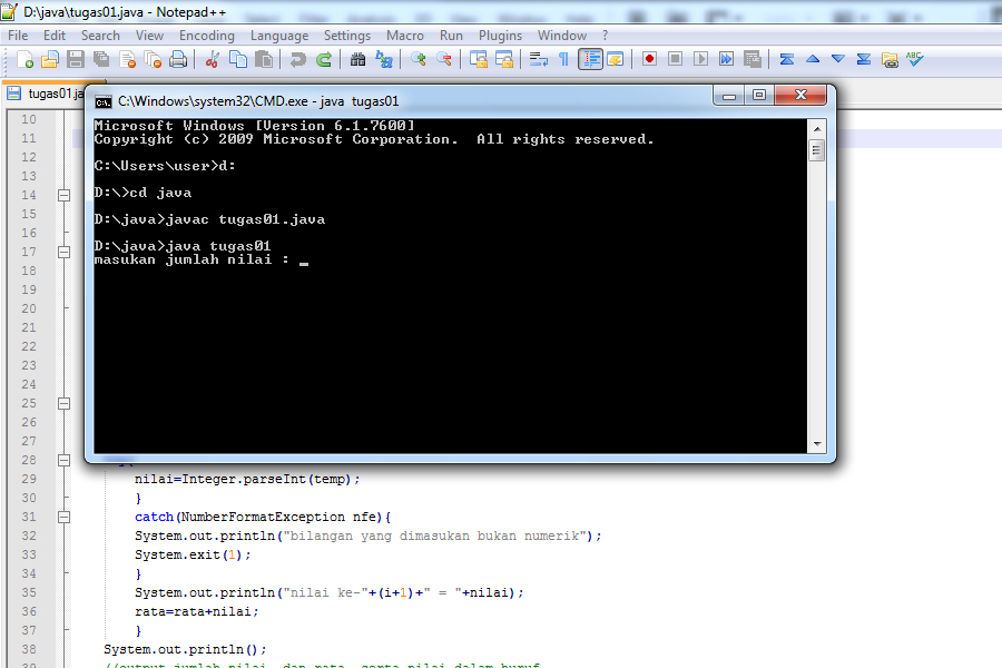 import java.io.*;public class tugas01{public static void main(String []sanul)throws IOException{InputStreamReader isr=new InputStreamReader(System.in);BufferedReader br=new BufferedReader(isr);String temp;int jml=0, nilai=0, rata=0;//input jumlah dataSystem.out.print("masukan jumlah nilai : ");temp=br.readLine();try{jml=Integer.parseInt(temp);}catch(NumberFormatException nfe){System.out.println("bilangan yang dimasukan bukan numerik");System.exit(1);}System.out.println("--------------------------");System.out.println();//input nilaifor(int i=0;i<jml;i++){System.out.print("masukan nilai ke-"+(i+1)+" : ");temp=br.readLine();try{nilai=Integer.parseInt(temp);}catch(NumberFormatException nfe){System.out.println("bilangan yang dimasukan bukan numerik");System.exit(1);}if(nilai>100){System.out.println("nilai melebihi batas nilai (100)");System.exit(1);}System.out.println("nilai ke-"+(i+1)+" = "+nilai);rata=rata+nilai;}System.out.println();//output jumlah nilai, dan rata, serta nilai dalam hurufSystem.out.println("jumlah nilai = : "+rata);rata=rata/jml;System.out.println("rata nilai = : "+rata);if (rata >= 90){System.out.println("Nilai dalam huruf anda adalah A");}else if (rata >= 70){System.out.println("Nilai dalam huruf anda adalah B");}else if (rata >= 60){System.out.println("Nilai dalam huruf anda adalah C");}else if (rata >= 50){System.out.println("Nilai dalam huruf anda adalah D");}else {System.out.println("Nilai dalam huruf anda adalah E");}}}